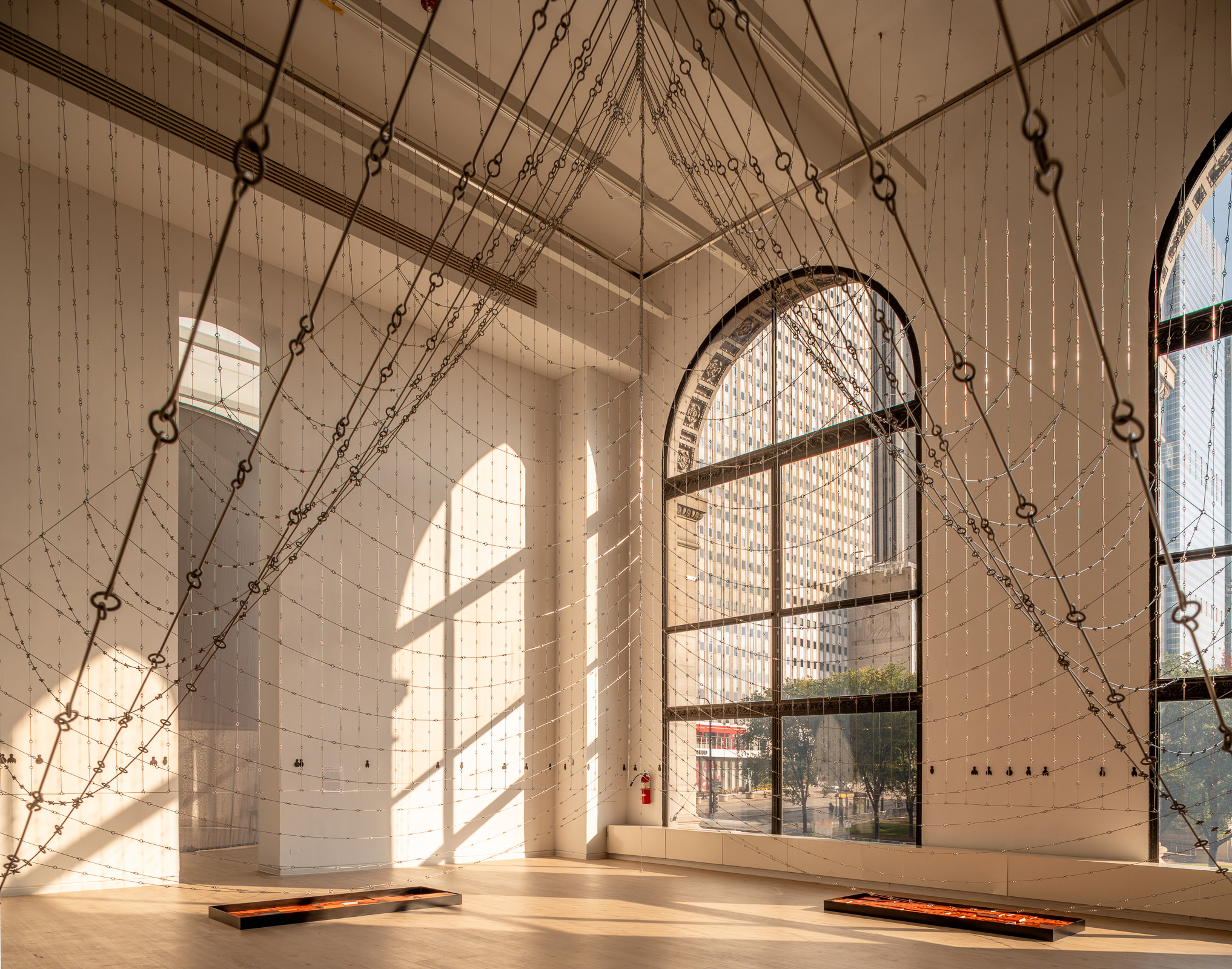 Type: Installation (in collaboration with: The Buell Center). Location: Chicago Architecture Biennial. Year: 2023-2024. AD—WO Team: Jen Wood, Emanuel Admassu, Katie Solien, Eric Hagerman, Gene Han. Buell Center Team: Lucia Allais (Director), Michelle Huynh Chu, Jacob R. Moore, Lucia Galaretto, Catherine Weilein, Maur Dessauvage, Clarisse Figueiredo de Queiroz. Engineering Consultants: Tom Reiner, Axel Kilian. Fabrication: Paul Russell, TheChicagoBlacksmith, Lawndale Forge (Chains); Corcoran Fabrication & Design, Inc. (Beam and Pits). Book Design: Marie Otsuka. Photography, unless otherwise stated: Tobi Abawonse.