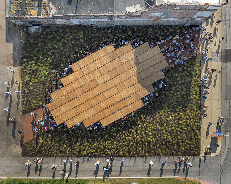 Ellipsis is a gathering space for Columbus, Indiana; designed and built as a 2025 Miller Prize installation for Exhibit Columbus.